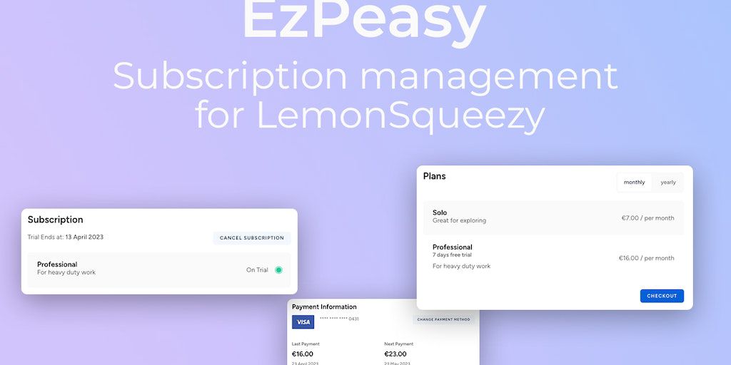 EzPeasy gives you and your customers a billing UI made specifically for LemonSqueezy subscriptions. This way you can focus on building. EzPeasy's free plan provides: 🛒 Plan selection 🤑 Subscription ma