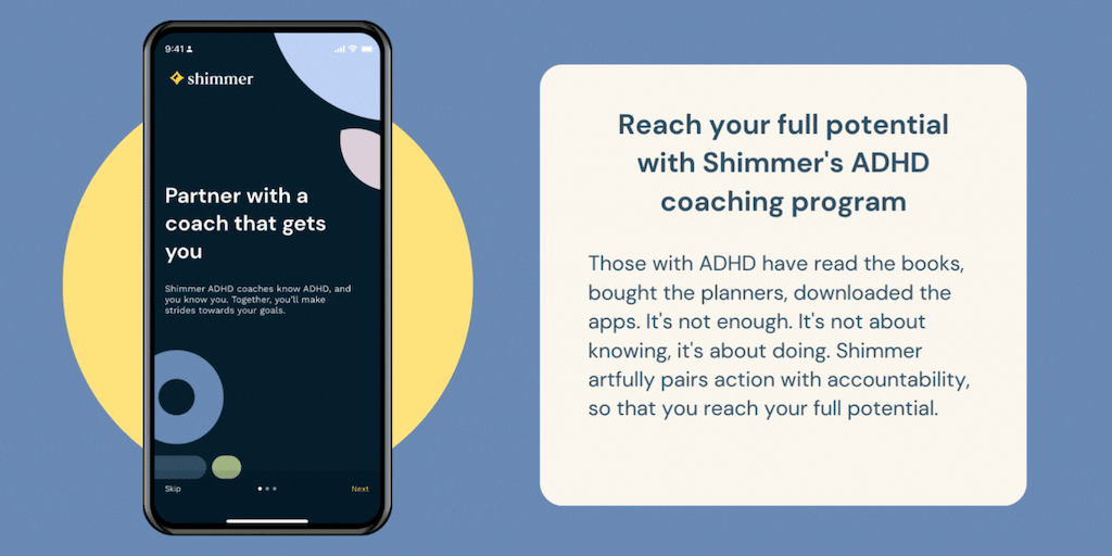 Shimmer offers 1:1 ADHD coaching at a fraction of the cost. Your expert ADHD coach will help you learn skills, build habits, and institute systems that are personalized for YOU.