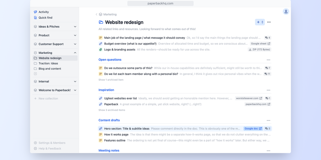 Paperback is a simpler and tidier alternative to wiki pages. Instead of burying stuff in deep hierarchies, it lets you create concise lists with your links, files, and notes. Then, people can actually