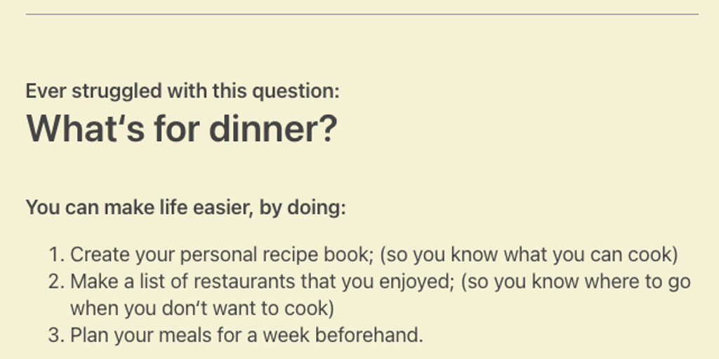 Ever struggled with this question: What‘s for dinner? You can make life easier, by doing: 1. Create your personal recipe book; 2. Make a list of restaurants that you enjoyed; 3. Plan your meals for a