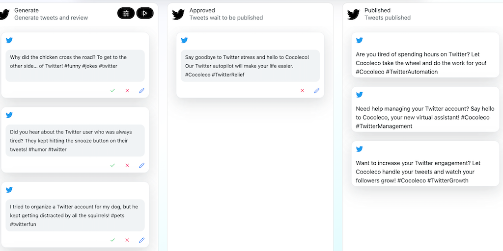 Cocoleco is an AI-powered Twitter manager that helps individuals and businesses save time and boost engagement. Our platform generates high-quality, on-brand tweets that you can easily approve or edit
