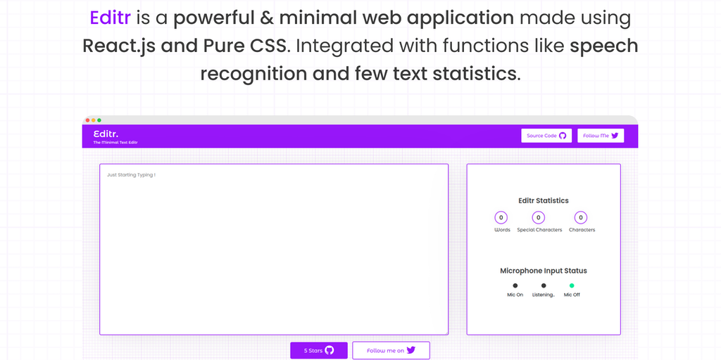 Editr is a minimal text editor which has been made up using React.js. Editr supports Speech Recognition and also displays the real-time text statistics. Editr is currently hosted at Netlify and its so