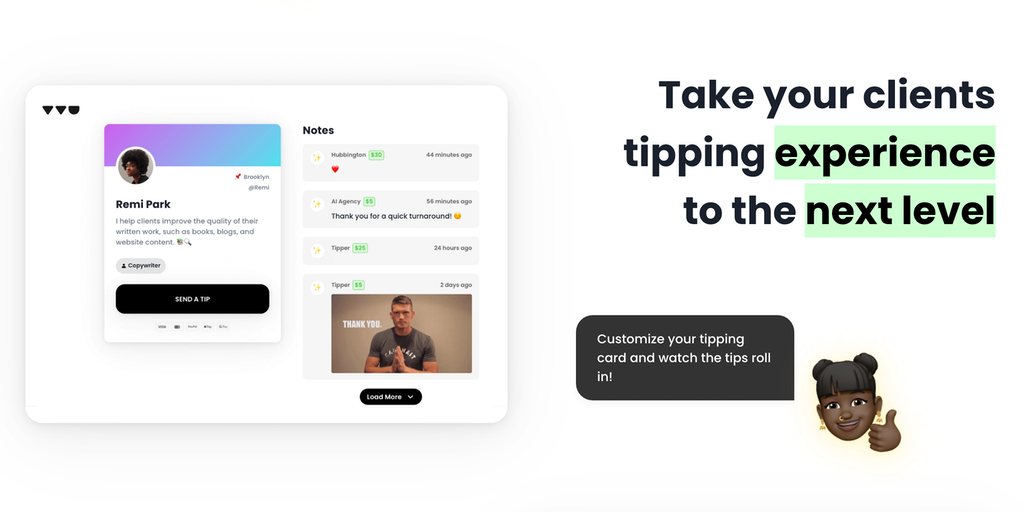 Tip Top Jar helps freelancers *earn more* and *build meaningful connections* with their tippers. 👥 Social tipping -- tips attached with notes, GIFs, & emojis 🤳 Get tipped via Card and/or PayPal with i