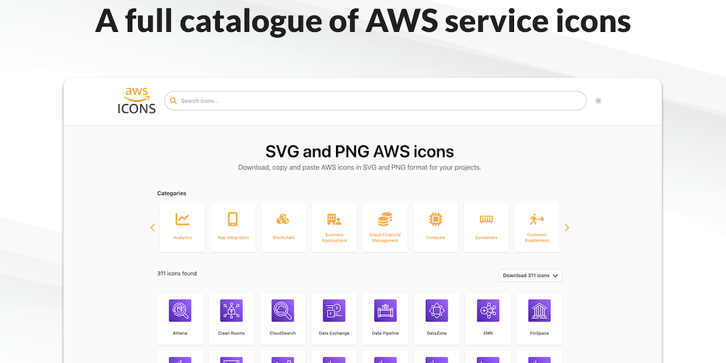 AWS Icons is a perfect place to discover, copy+paste or download high-quality AWS service icons that you use within your tech stack. Get the latest icons in SVG and PNG formats, webpage links and docs