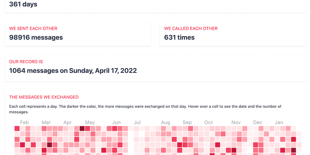 The desktop app allows displaying statistics of your Signal Desktop chats. The app is ideal for long-distance couples, friends, and anyone who wants to cherish their chat history with essential people
