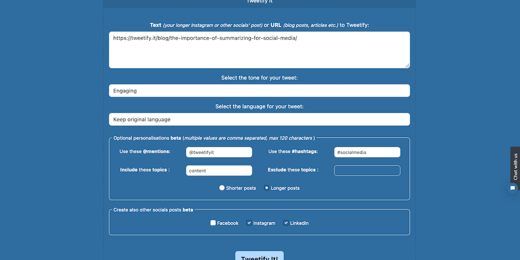 Quickly transform any long-form content (from text or URL) into personalised, short social posts & tweets. Customise tone, topics, format, tags, length & language. Share your content on social media w