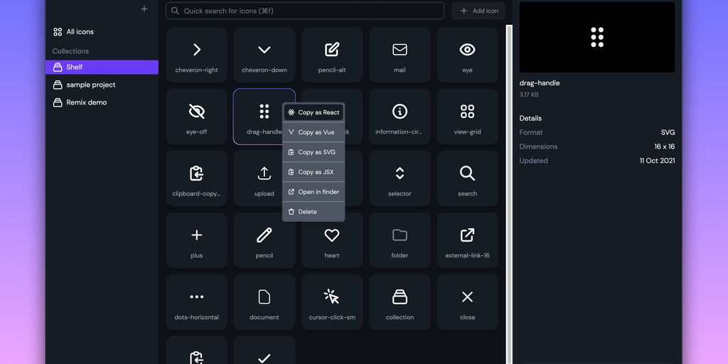 Icon Shelf is a free and open-source SVG icon manager for web developers. Improve how you add icons to your frontend project. All your icons in one place, easily copyable as code.
