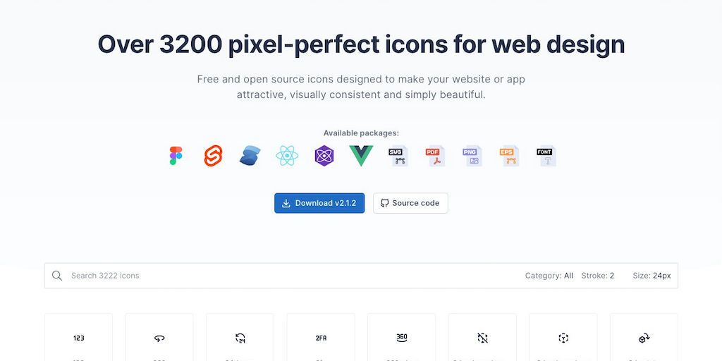 Tabler Icons 2.0 contains over 3200 icons in 10 formats: React, Vue, Svelte, SolidJS, Preact, JavaScript, PNG, PDF, EPS, and Webfont. Perfect for UI enhancement in various projects, these icons offer