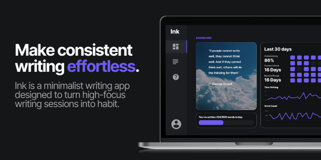 Ink is a minimalist writing tool designed to turn high-focus writing sessions into habit. 1. Set a custom writing goal 2. Write in an interface that helps you focus 3. Track your progress and create a life-changing habit