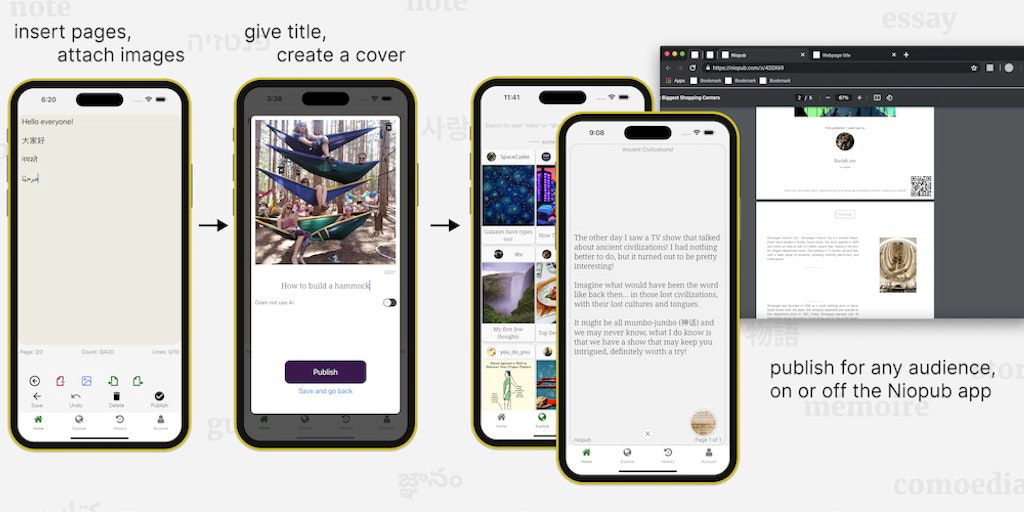Telling stories has been something we've done since the dawn of our intelligence. Niopub provides a global platform for humans to explore or quickly publish their thoughts. It imagines a world where a