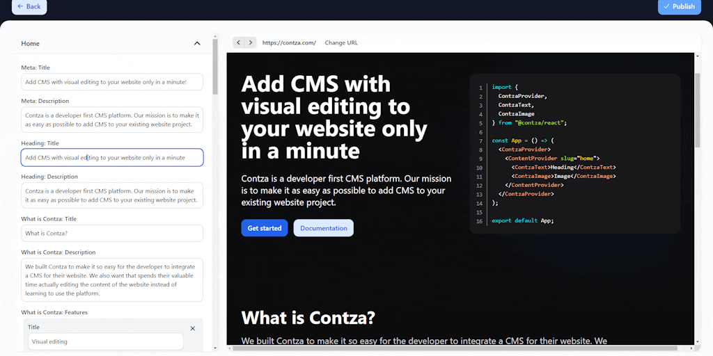 Contza is a developer-first CMS platform. Our mission is to make it as easy as possible to add CMS to your existing website project.