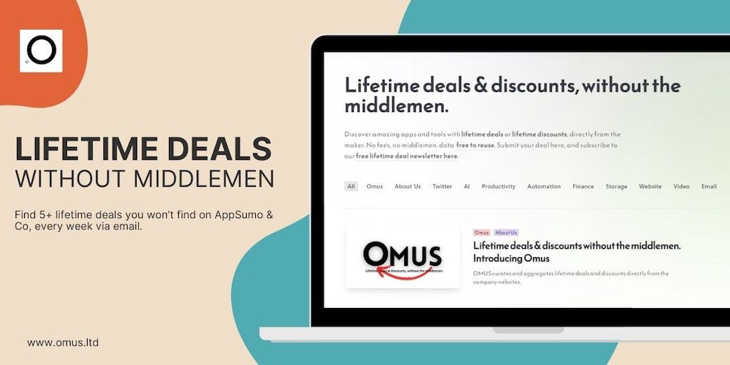 Omus lists lifetime deals offered only on the makers' websites. Every week we add 5+lifetime deals which you won't find on AppSumo & Co. Please submit self hosted lifetime deals and/or sign up to our