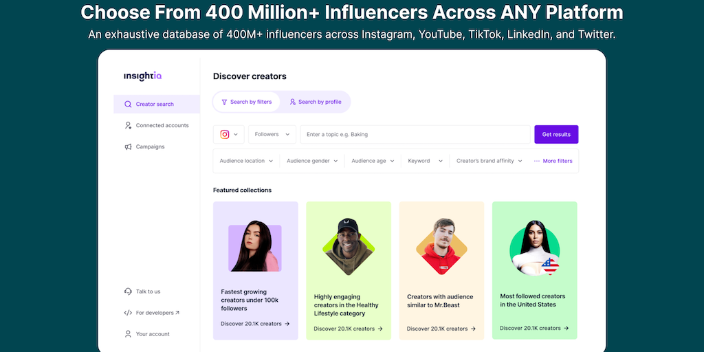 insightIQ is the ultimate influencer marketing tool that helps brands get maximum ROI. Give it a spin to discover 400 Million+ influencers using 50+ search filters, partner with the ones who match you