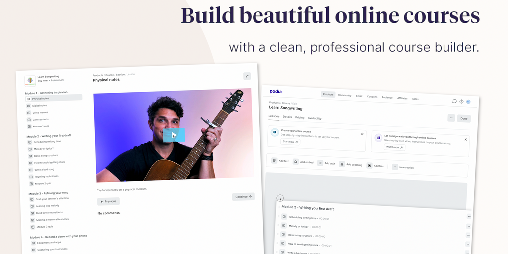 Podia is a platform that lets you build a free, no-code website, host a community (free or paid), and sell your digital products. With Podia, you get all the tools you need to start and grow an online