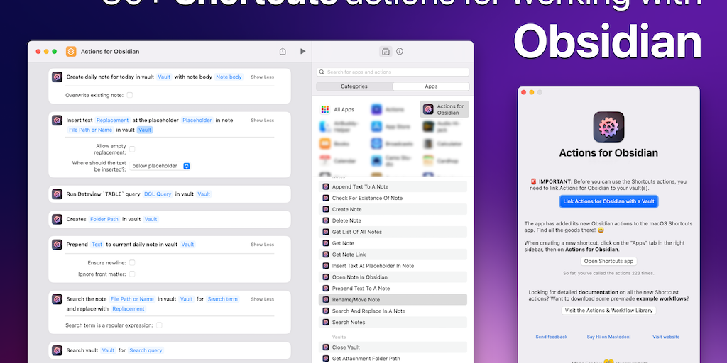 The missing link between macOS and Obsidian, the personal knowledge management tool: 30+ Shortcuts actions to bring your notes and your automations together. It makes Obsidian a first-class productivi
