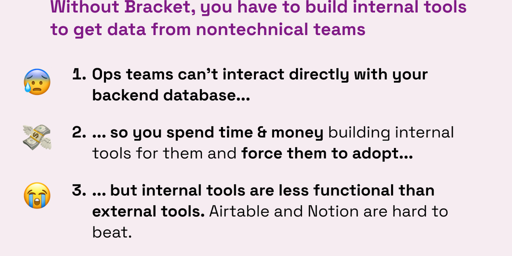 Bracket is the two-way data pipeline between popular business tools and backend databases. For example, when ops teams update data in Airtable, and engineers update data in MongoDB, Bracket connects t