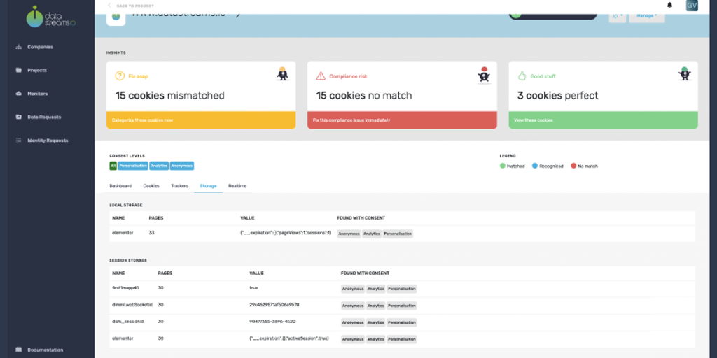Automatic recognition and classification of all your cookies A complete overview of matched and non-compliant cookies, local/session storage, tracking pixels, and third-party trackers by consent purpo