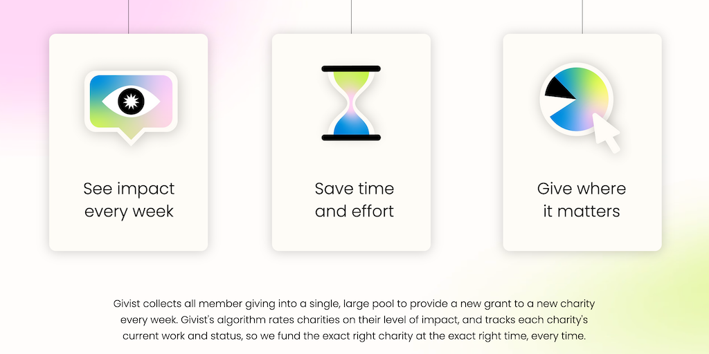 Givist pools member giving and donates the total to a new charity every week. Choose how much you want to give, subscribe, and automatically support over 50 charities every year. Easy, efficient, effe