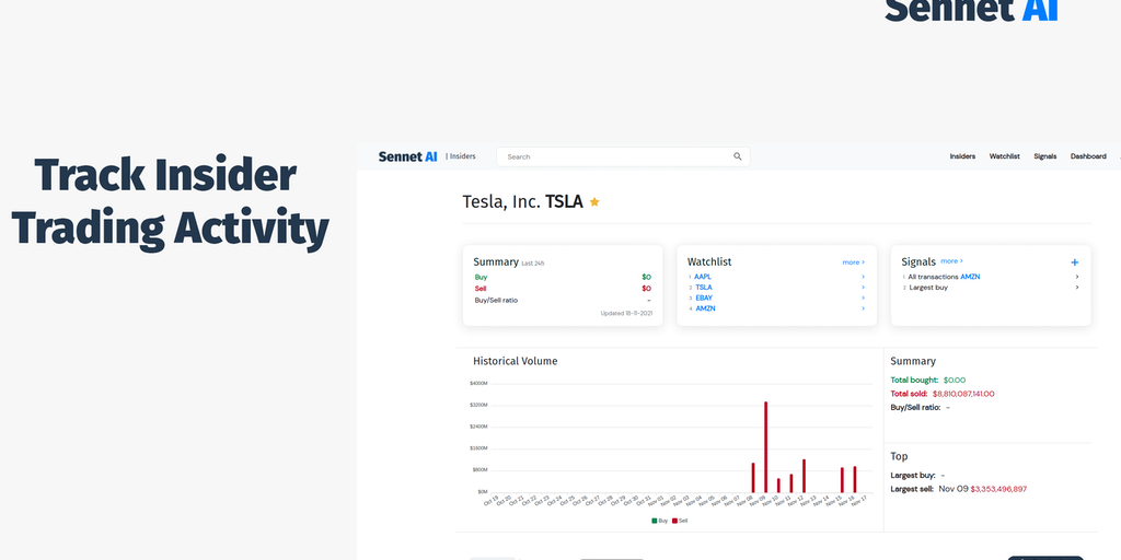 With Insiders you will be able to track insider activity for any public US company. Discover the latest insider trades, create alerts on new transactions and dive into historical data, all from a unified platform.