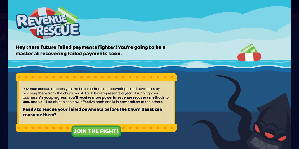 Revenue Rescue is an educational game that teaches you the best ways to recover failed payments. In the game, you literally fight the churn beast that lurks in all subscription businesses, waiting to