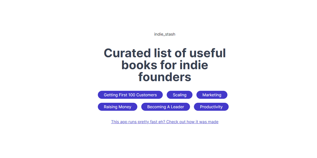 Indiestash is a curated collection of useful books for indie founders on topics like - Getting First 100 Customers, Scaling, Marketing, Raising Money, Becoming A Leader, Productivity.