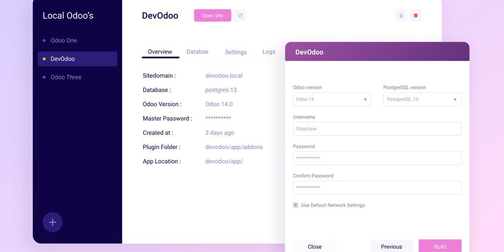 DevOdoo is a local development suite for Odoo App available for Windows, Mac, and Ubuntu/Linux. Easily develop addons, themes on your local machine.
