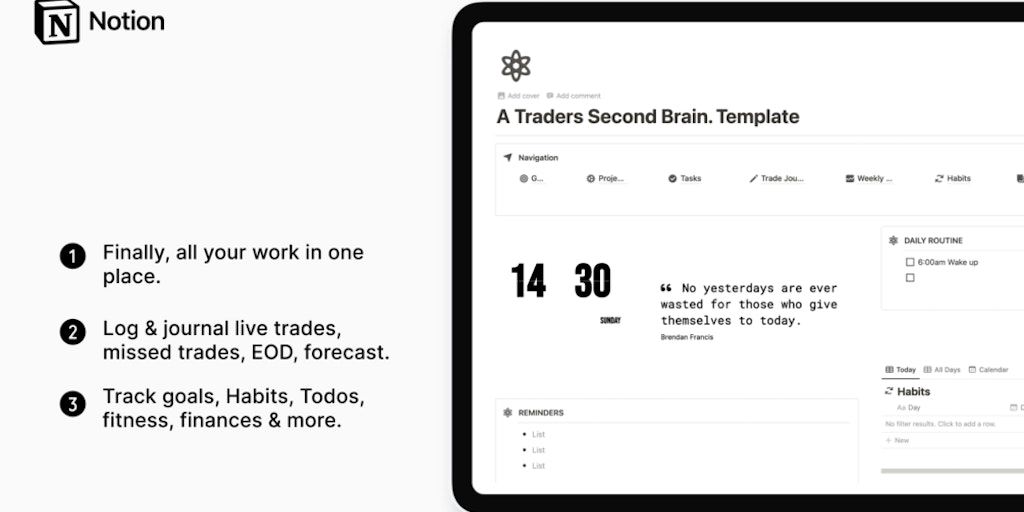 Second Brain is a Notion system that helps you capture your live trades, forecasts, markups, habits, notes, tasks, projects, resources, fitness, finances and much more all in one central hub. What get