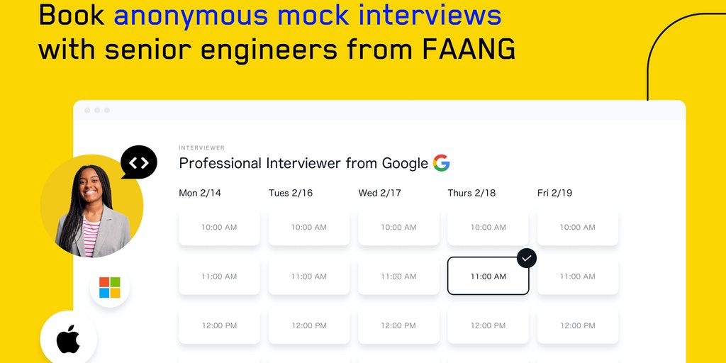 Anonymous mock interviews with engineers from Google, Facebook, and other top companies. Get actionable feedback, get awesome at algorithmic & sys design problems, and get fast-tracked at top companie