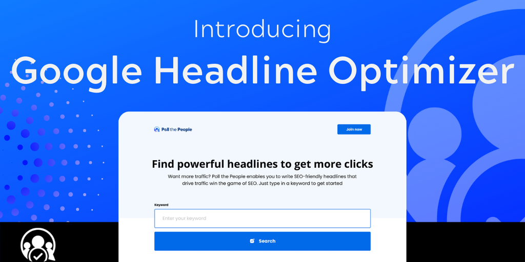 The Google Headline Optimizer by Poll the People allows you to write user-friendly headlines that drive clicks. Optimize your headlines by tying them directly to your keywords and targets.