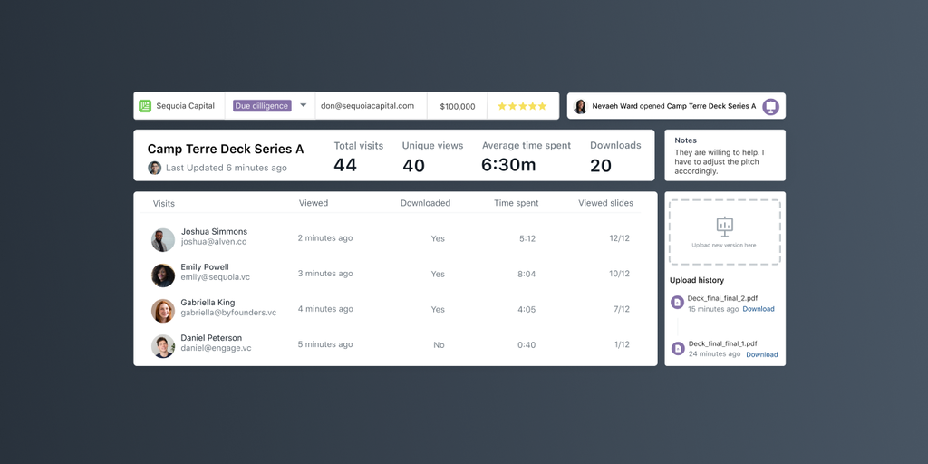 Decks are a dead-simple way to host and share a pitch deck using Visible. Decks are completely integrated with our fundraising CRM and leading investor updates platform.