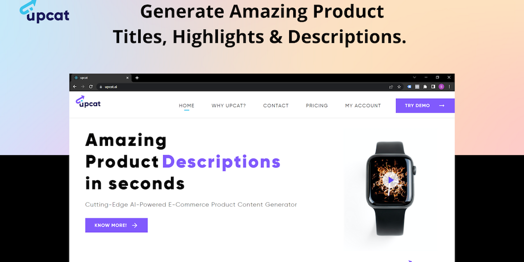 UpCat is an AI 🤖 Product content generator for eCommerce listings 🛒. Generate Product Titles, Product Highlights/ Bullet-Points & Keyword-Rich Product Descriptions in seconds. Upcat generates Keyword-