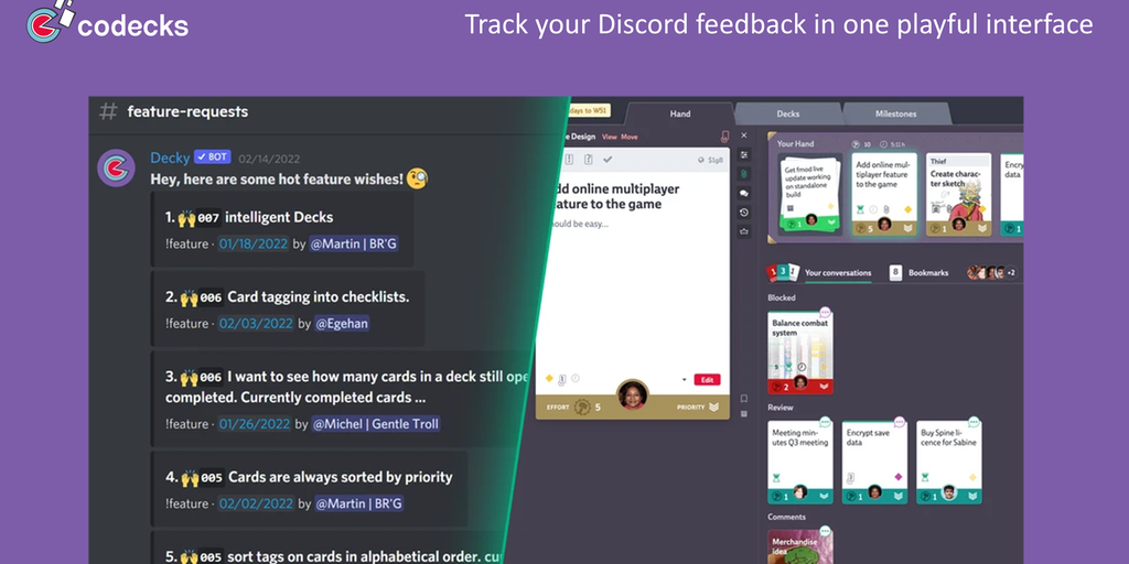 Overwhelmed with feedback on Discord? Collect feedback in a structured way. Lacking Discord engagement? Rally your fans with real-time updates. Can't decide which feedback to work on? Let your communi