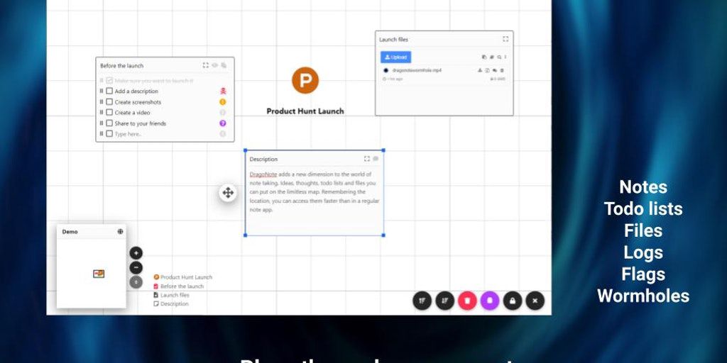 In DragoNote you put your notes on the limitless map. Key features: 📝 Text notes ☑️ Todo lists 🗃 Files 📖 Logs 🕳 Wormholes (map shortcuts) 🔐 Password encryption (only someone knowing the additional pas