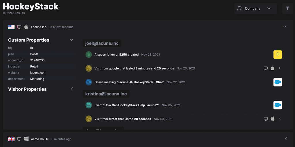 HockeyStack brings all the touchpoints from marketing and sales across channels from all stakeholders of each account on a single journey. You can see all of the previous touchpoints of an account & u