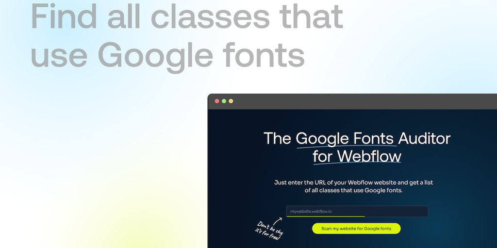 The Google Fonts Auditor for Webflow is a tool that finds embedded Google fonts in your Webflow website and all classes using them. It helps you to save a lot of time while revising your project.