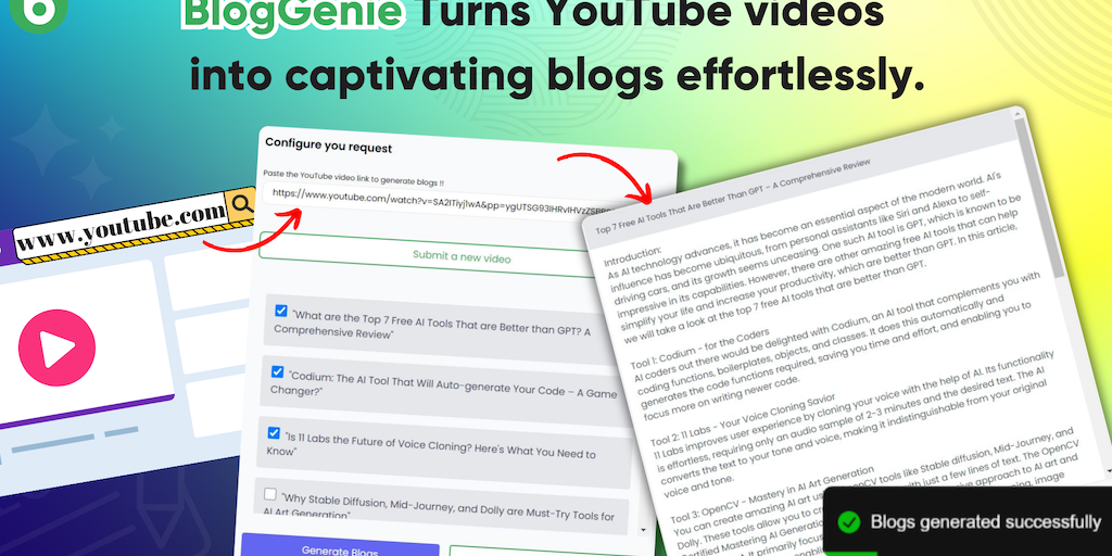 Paste a YouTube video link, our AI creates insightful questions based on the content. Select your preferred questions, and BlogGenie will magically generate blogs 📝 for you. Publish directly to WordPr