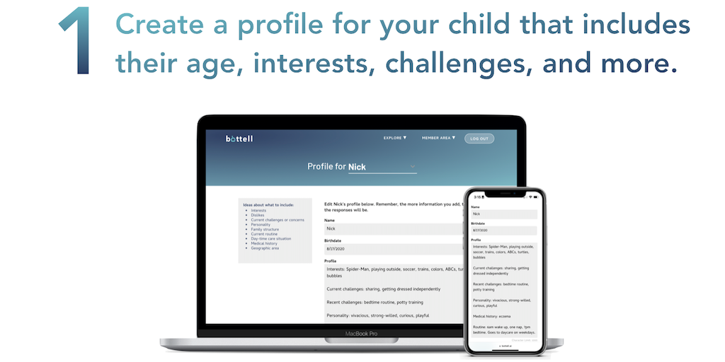 Bottell is your assistant for all things Parenting. Simply set up a profile for your child and Bottell will give you personalized advice, activity ideas, meal plans, milestone guidance, product recomm