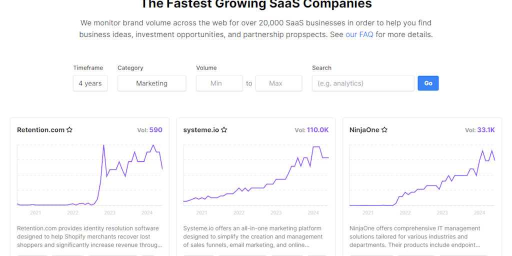 A comprehensive database of trending SaaS products. We monitor 20,000+ SaaS businesses (and growing +), and rank them based on the growth rate of their brand search volume.