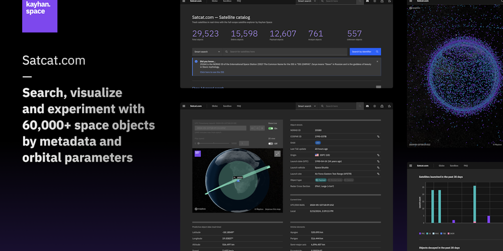 With over 60,000 objects in our database and up to four years of space data, Satcat.com is designed to help you track, research, and experiment with satellites and their orbits.
