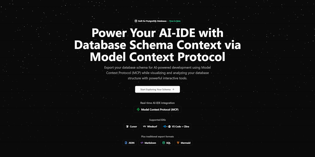SchemaFlow provides real-time PostgreSQL & Supabase schema access to AI-IDEs through Model Context Protocol (MCP). Features live schema sync, interactive visualizations, and multi-format exports (JSON