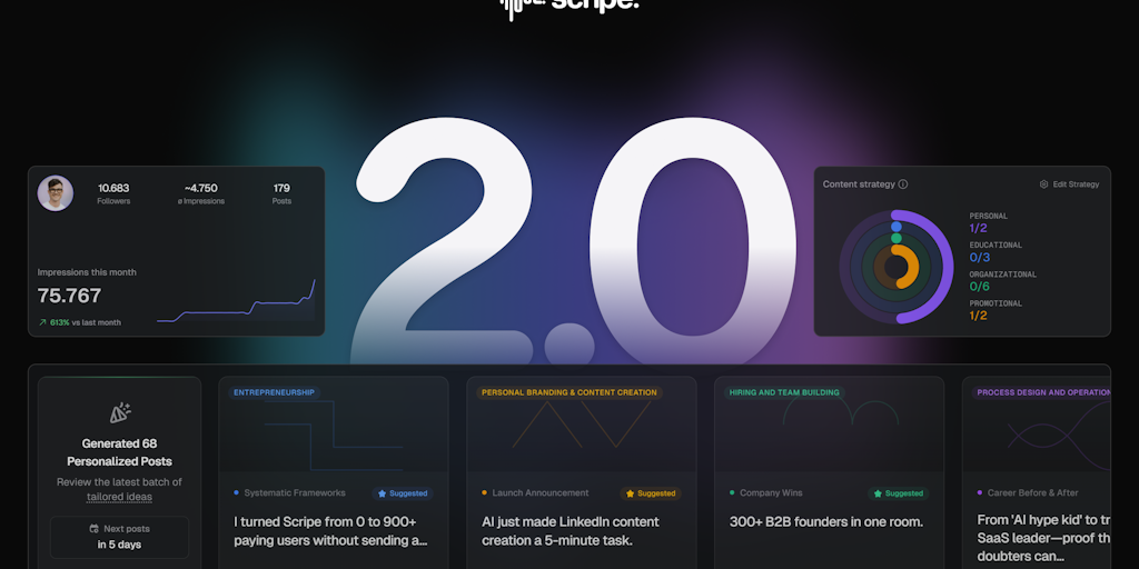 Scripe knows what works by analyzing thousands of viral LinkedIn posts daily. Like a personal content strategist, Scripe knows what works by analyzing thousands of viral LinkedIn posts daily uniting i