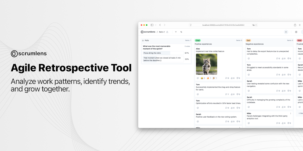 Scrumlens is an open source tool for team reflection and Agile evolution. Analyze work patterns, identify trends, and grow together.