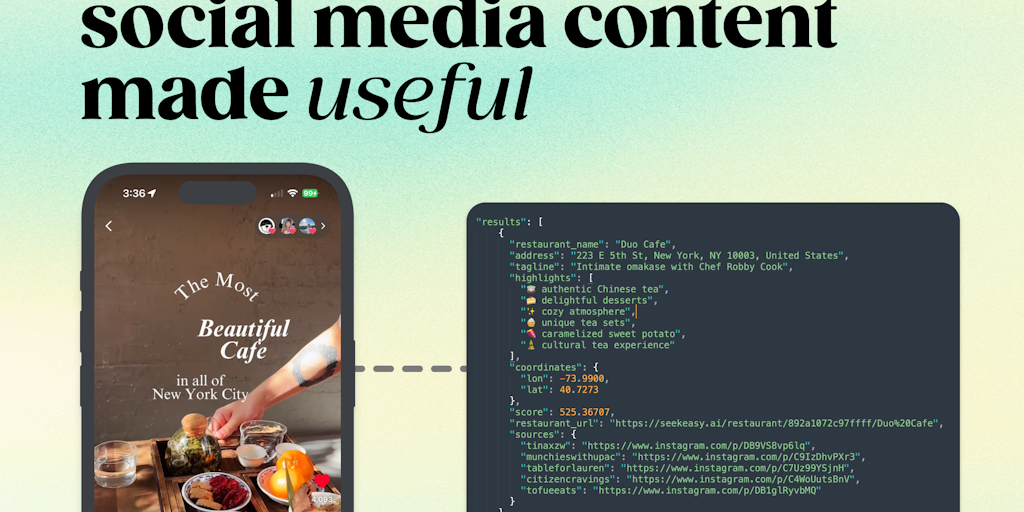 Explore Seekeasy's data with our MCP which returns recommendations for restaurants based on social media creator content. Understand the shape and trends of social media through the eyes of your favor