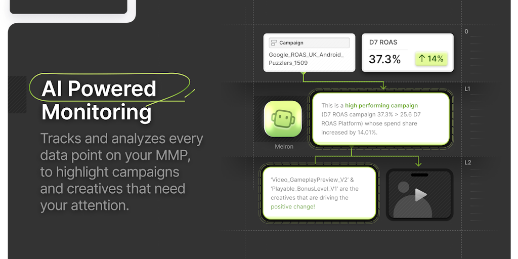 Automatically tracks and monitors every data point in your MMP everyday. You'll receive daily alerts on campaigns and creatives that are impacting your ROAS or behaving unexpectedly. Start your free t