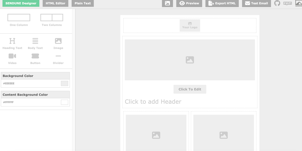 The SENDUNE email designer focuses on simplicity and ease of use. It is lightweight. It does pure HTML - no intermediate code wranglers like mjml. There is no lock-in of any kind. Save HTML output as