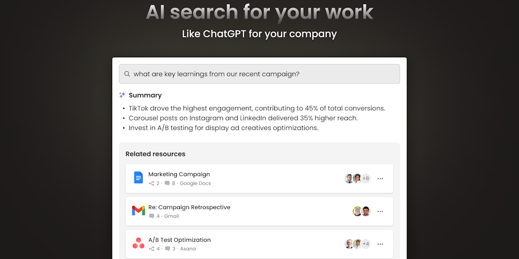 Sense gives you a ChatGPT-like search for your company. For each project and person in your team Sense uses AI to automatically organize related resources and updates across all apps.