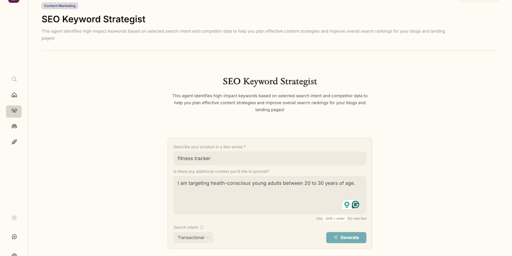This AI agent identifies high-impact keywords based on selected search intent and competitor data to help you plan effective content strategies and improve overall search rankings for your blogs and l