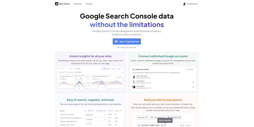 Streamline SEO analytics for all your websites with a single intuitive dashboard. Avoid the complexities of Google Search Console and effortlessly access key insights across all your sites.