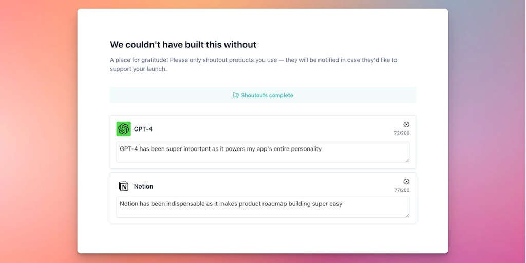 In your next launch, you can highlight up to 3 products that were indispensable in building your product, along with a note explaining why you love them. They'll also be notified that you gave them a