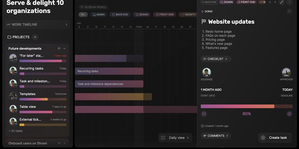 Shram is a gamified work management tool. Not only can you manage projects and tasks but also get real-time reports on each team member's performance. Your productivity is no longer based on number ho